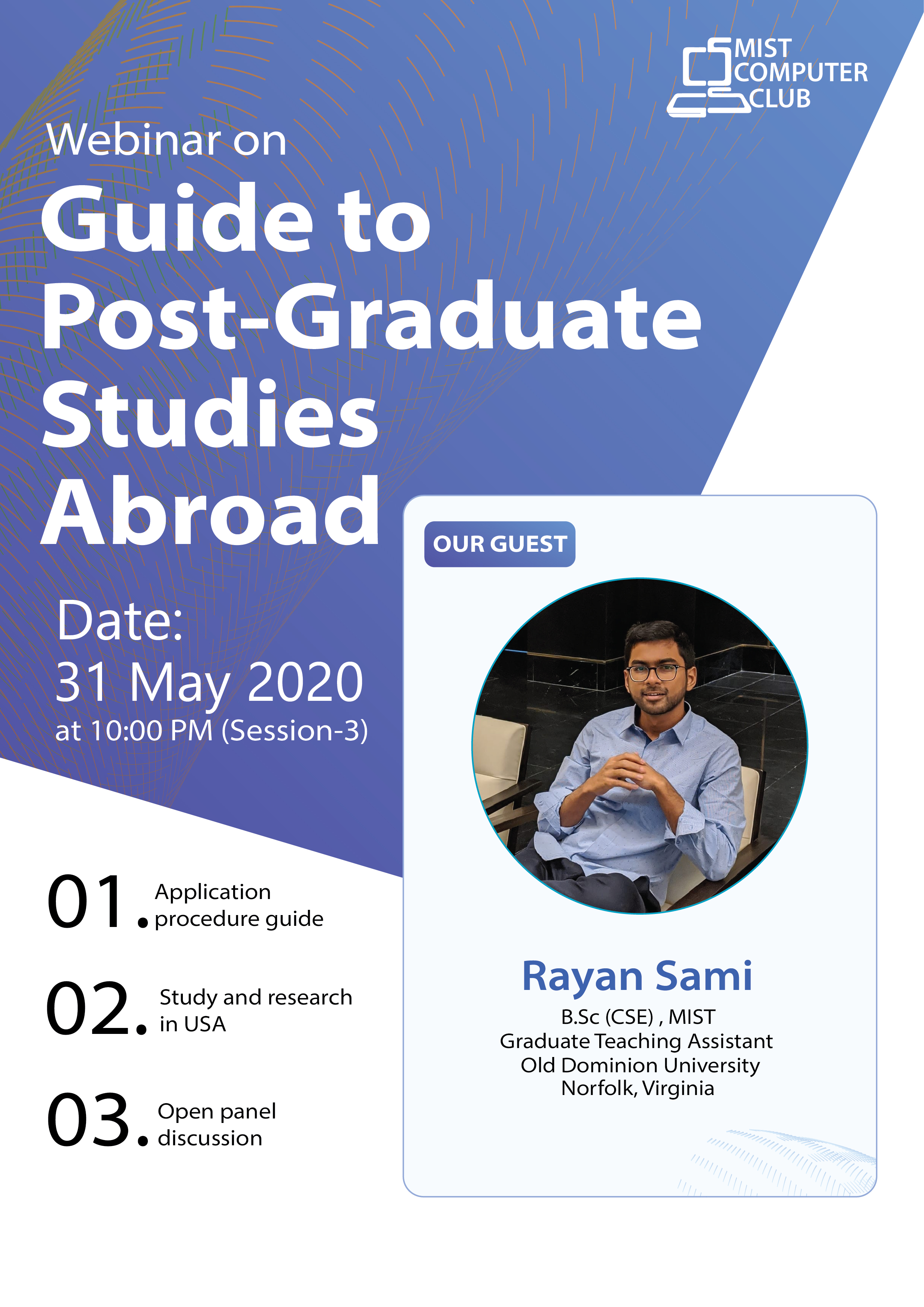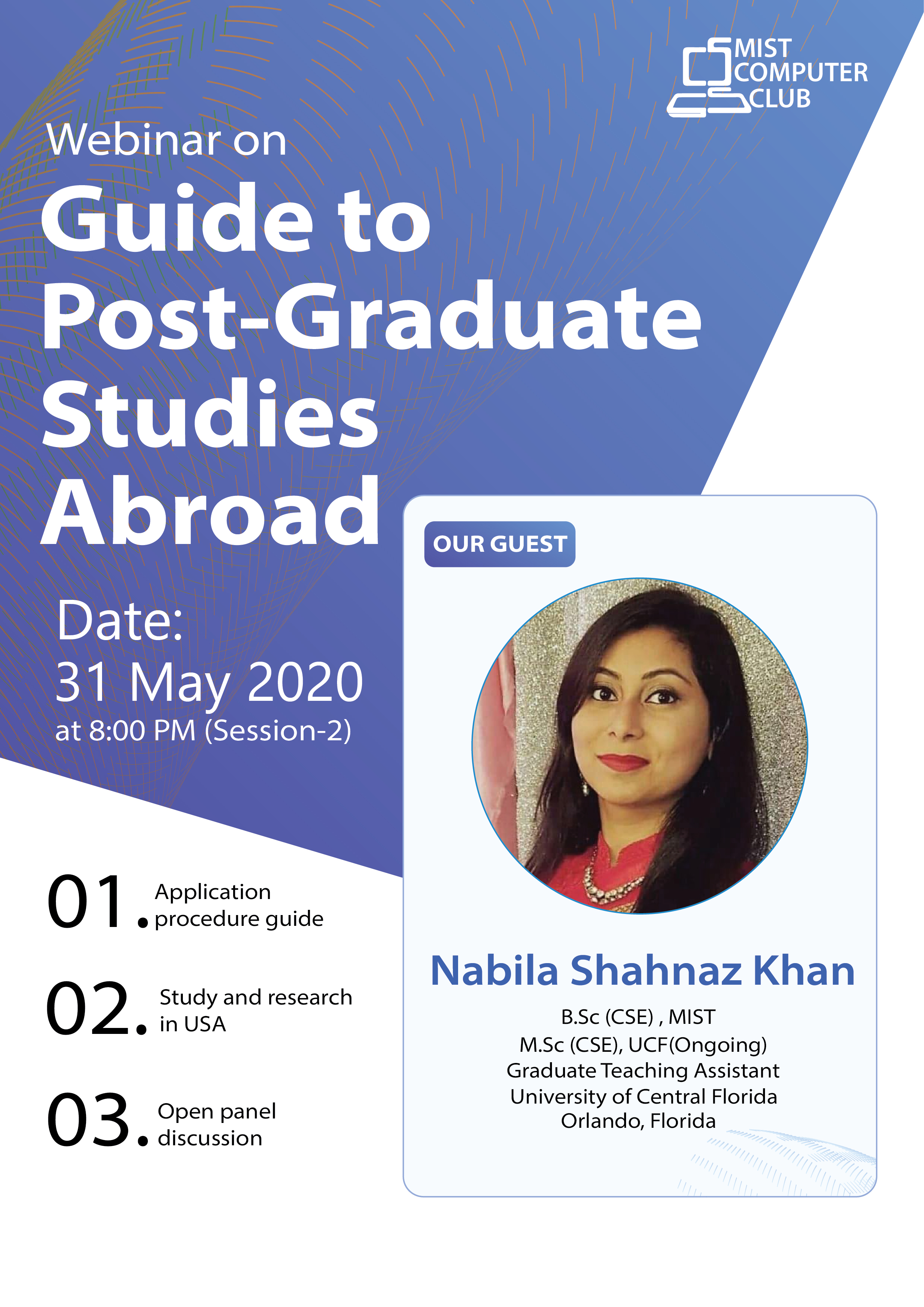 A webinar on "A Guide to Postgraduate Studies Abroad" was arranged by MIST Computer Club (MCC), a part of the Department of CSE, MIST.