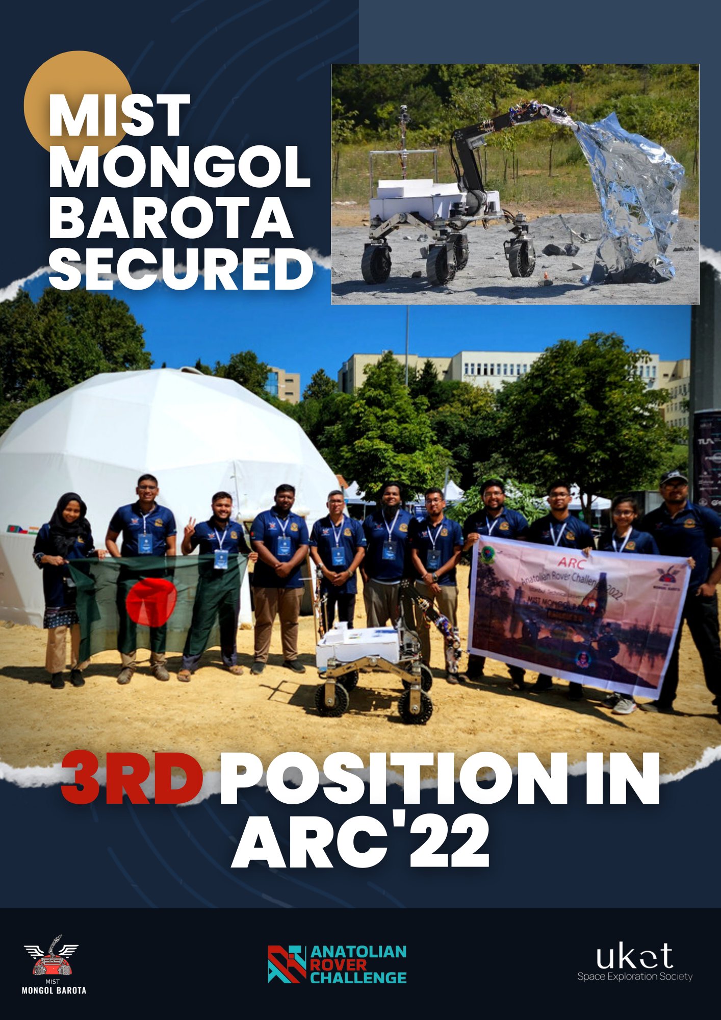 MIST Mongol Barota Team secured 3rd position in ARC 2022 org by Space Exploration Society (UKET), Istanbul, Turkey. The first position is secured by Poland and the second position by India. 14 teams from Bangladesh, the Czech Republic, India, Poland, Turkey, and the UK were selected for the final round. More than 200 team members attended the final competition.