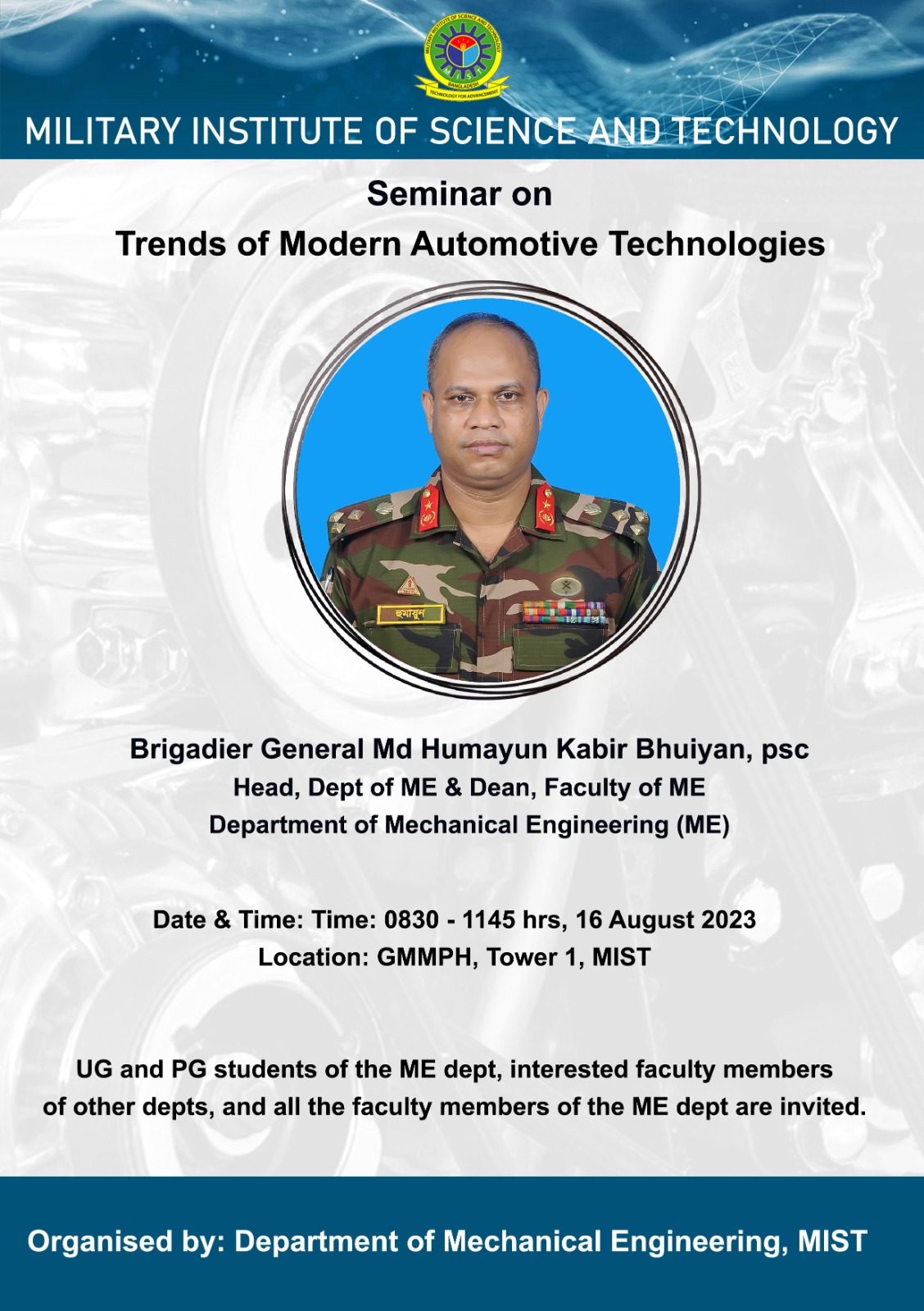 A seminar on Trends on Modern Automotive Technology was held at GMMPH in MIST. Brigadier General Md Humayun Kabir Bhuiyan, psc, Head, Dept of ME & Dean, Faculty of ME was the keynote speaker of the seminar. Among the attendees faculty members of ME Department, faculty members of ME faculty, interested faculty members of other department, students of ME department and interested students of other departments.