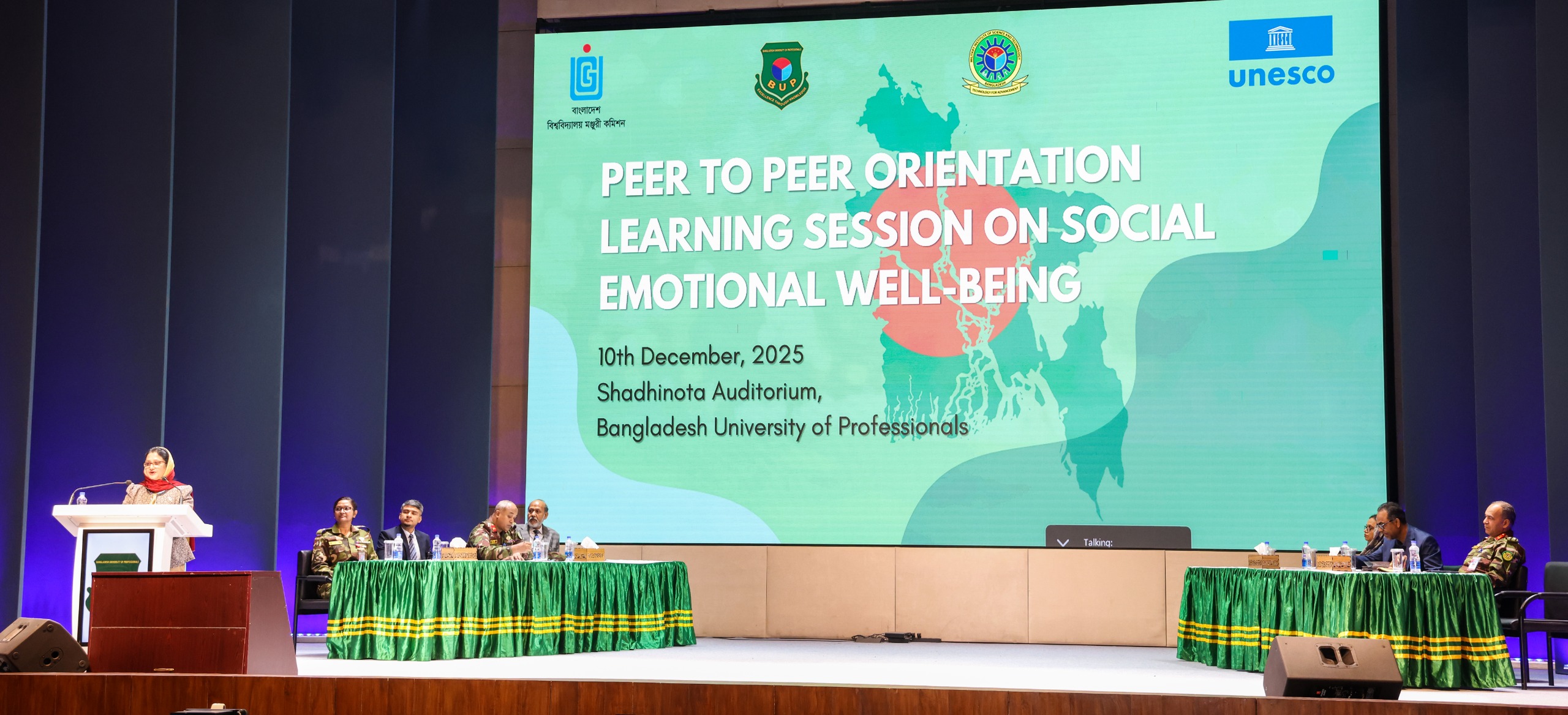 A Peer to Peer Orientation Learning Session on Social Emotional Wellbeing (SEW) was held today from 1030 hrs to 1200 hrs at Bangladesh University of Professionals (BUP) under the joint initiative of UGC and UNESCO Bangladesh.