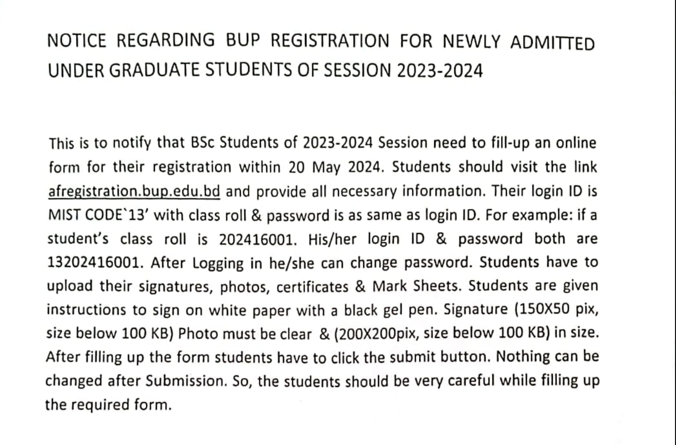 BUP Registration for newly Admitted Under Graduate Students of Session 2023-24