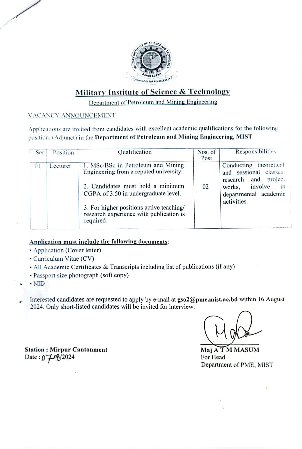OTM-3 (Lab Equipment) Purchase Quotation Notice by Admin Wing, MIST