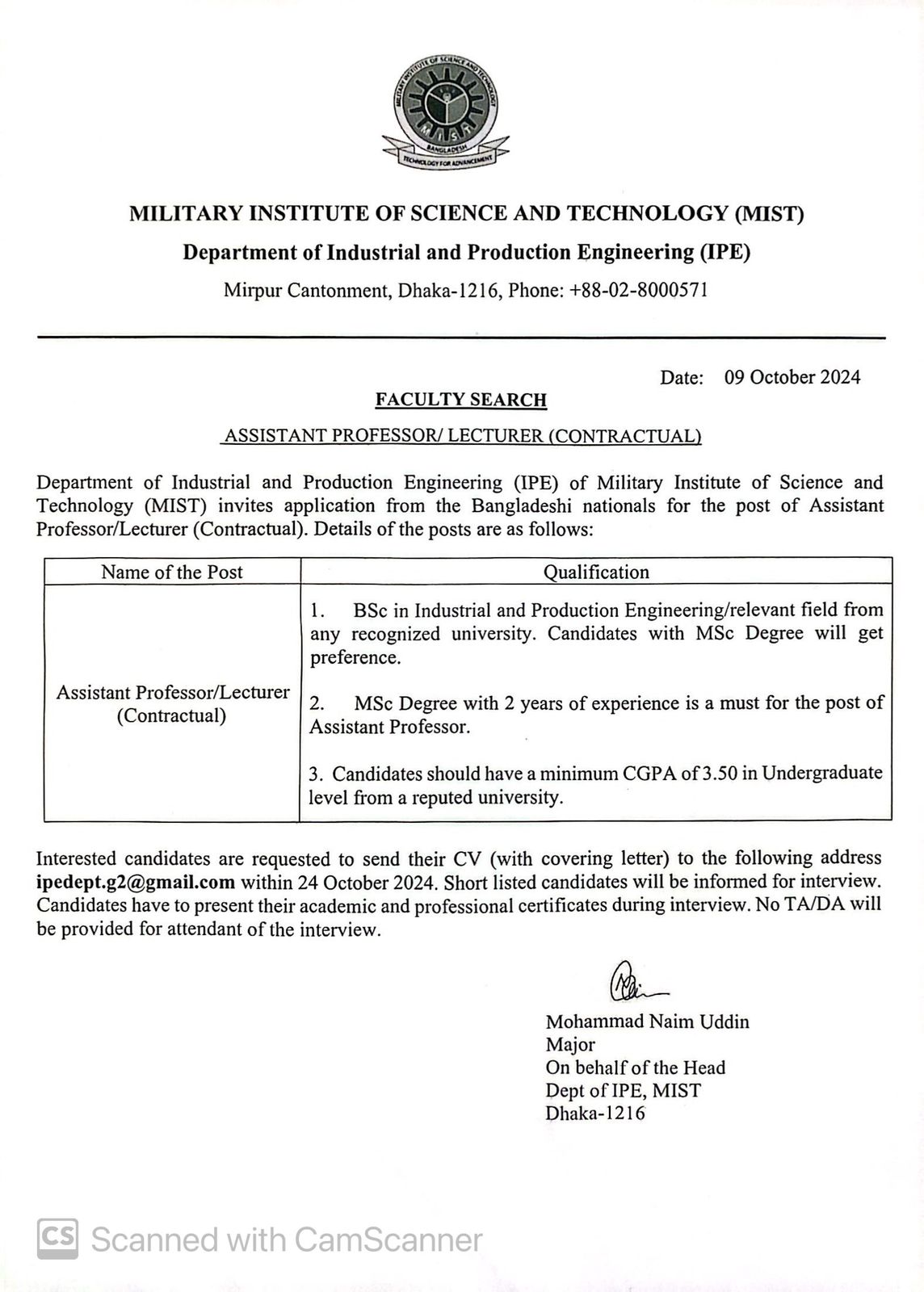 Employment Opportunity at Department of IPE