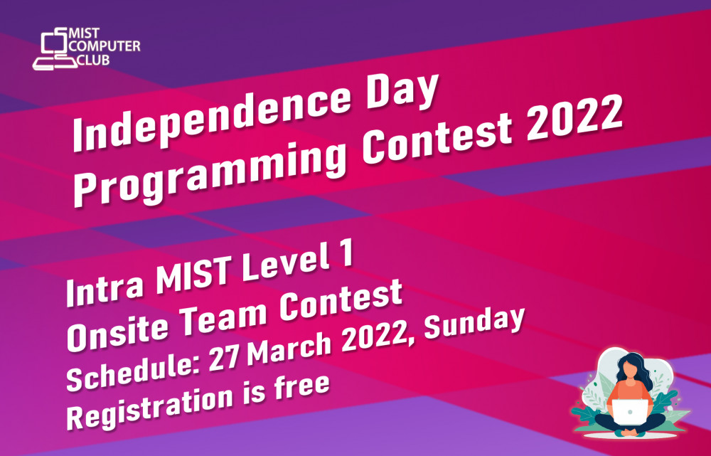 MIST Computer Club is going to arrange the 'Independence Day Programming Contest 2022', an onsite team contest for the students of level 1, MIST. Each team will consist of three members. The platform for the contest will be Codeforces Gym. The contest will be held for 3 hours 30 minutes from 0930 to 1300 on 27 March 2022, Sunday at Multimedia and Graphics (MMG) Lab, 3rd Floor, Tower-2. The problems are set by current-members as well as some ex-members of MCC who have high expertise in this area.
